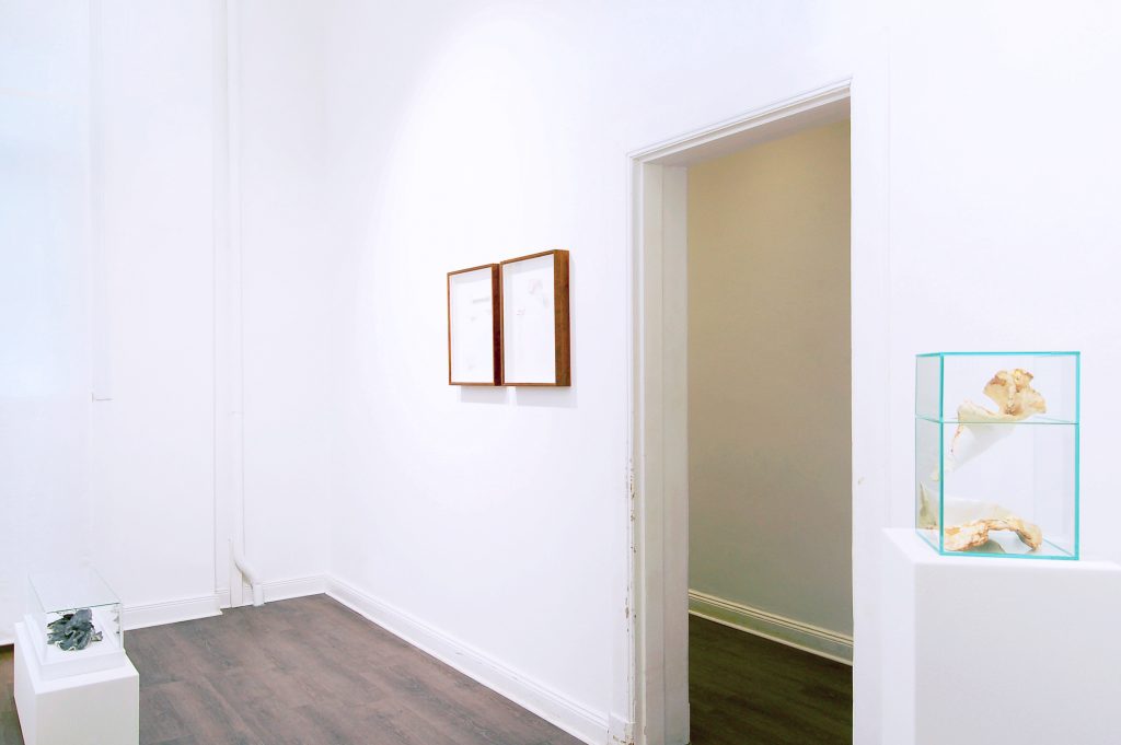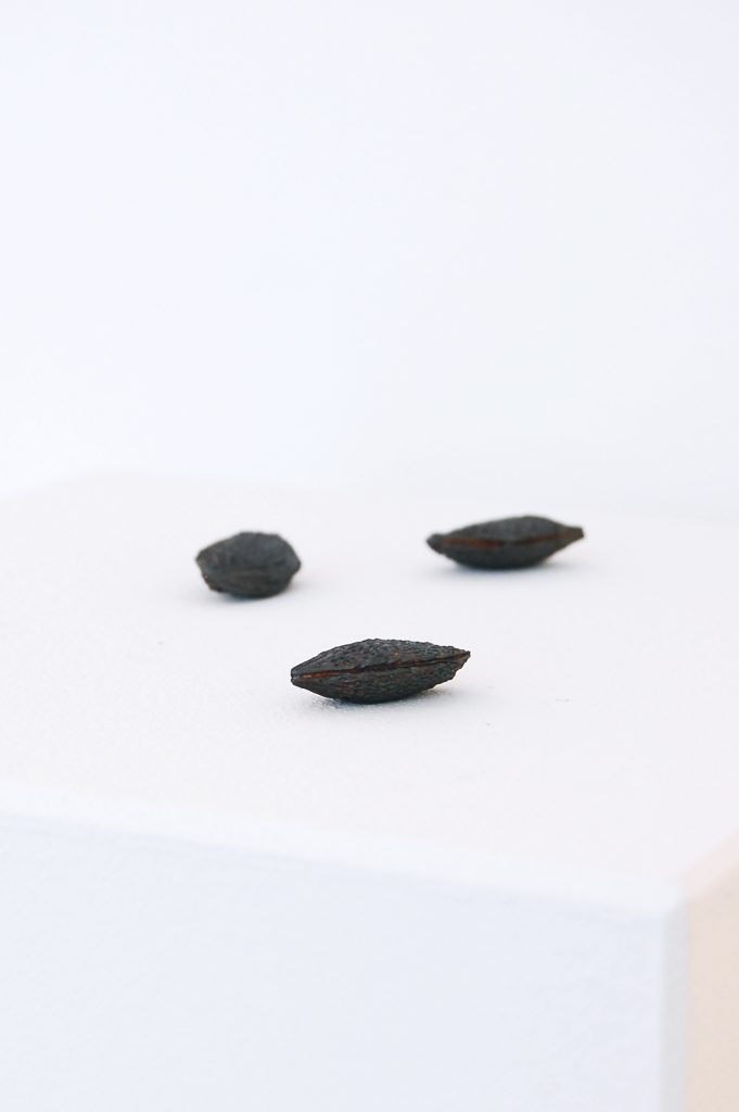Ausstellungsansicht / vorne: im Raum I (2024), mittig: Pflaumenkerne in Graphit (2025), hinten: Zeichnung mit Pflaumenkern klein (2025), Foto: Lorenz Wendt
