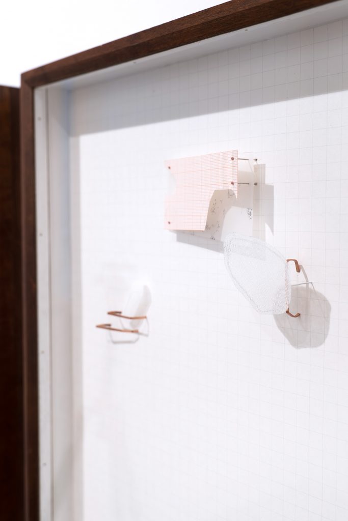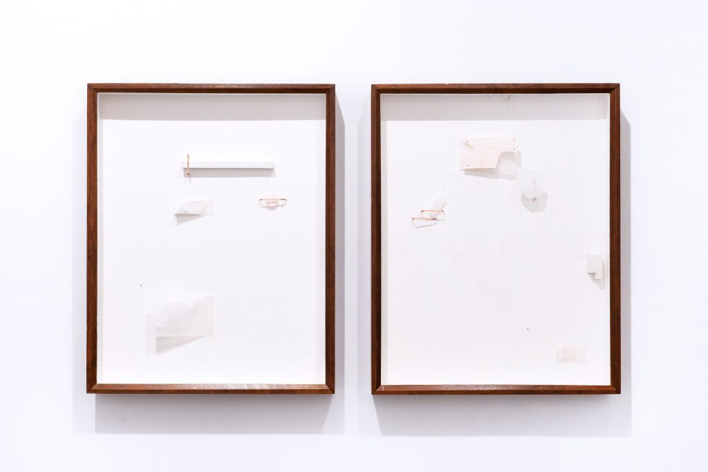Detailansicht / aus der Struktur (aufsteigend), 2025, Modellgips, Transparentpapier, Millimeterpapier, Modelliermasse, Stecknadeln, Wandfarbe, Graphit, Bleistift, Kartonklammern, 50cm x 40cm x 6cm
